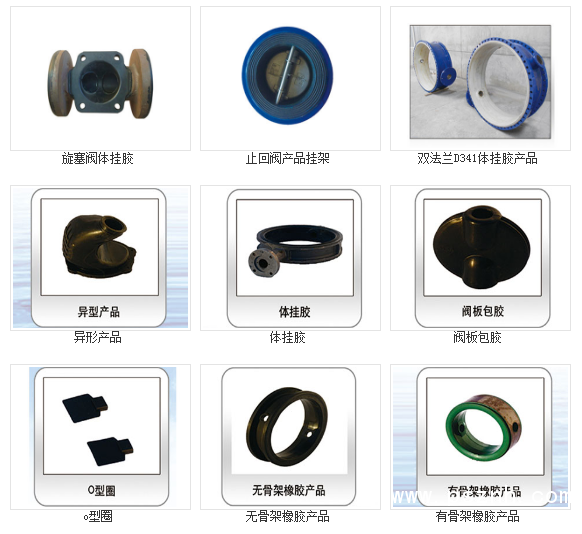我公司的主要产品分为橡胶和阀门两种,各种橡胶中线蝶阀阀座,带骨架和无骨架两大系列,规格1.5寸-80寸,软密封闸阀阀板挂胶,中线阀体挂胶,D41系列,D343系列,止回阀系列挂胶,O型圈,适用介质为:化工、冶金、自来水、纯净水、海水、污水、高温、低温、耐磨橡胶,根据客户提出的介质要求,选用胶种。桥梁支座同样也是我公司的主导产品,圆形、矩形规格齐全,可根据不用温度地带,选用不同的胶种。橡胶品种已形成6大系列,30多个品种,以每年60万件的生产能力向客户提供优质的产品。我公司阀门产品有对夹式蝶阀、法兰中线蝶阀、U型蝶阀脱硫蝶阀、煤矿瓦斯蝶阀等产品。产品质量一直保持国内的领先水平。公司产品广泛用于水处理、环保工程、电站煤炭等领域。目前产品远销国内高端客户及出口。