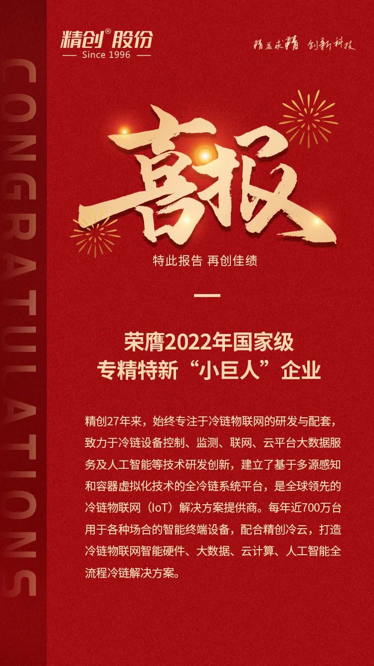 2026-01-19近日,工业和信息化部第四批国家级专精特新“小巨人”企业名单公示出炉,江苏省精创电气股份有限公司成功上榜。 专精特新“小巨人”企业,是指专注于细分市场、聚焦主业、创新能力强、有较强品牌知名度、市场占有率高、成长性好的企业。身怀绝技却默默无闻,独占鳌头又是隐形冠军,这或许就是专精特新“小巨人”的特征。 在当前经济社会发展形势下,国家级专精特新“小巨人”企业在引领实体经济,特别是制造业做实、做强、做优,提升产业链、供应链稳定性和竞争力方面处于举足轻重的地位,在稳定国家经济社会发展方面发挥了中流砥柱的作用。 近年来,精创积极响应国家、省、市关于“专精特新”企业的相关决策部署,此次入选国家级专精特新“小巨人”企业,标志着精创得到了国家级层面的肯定,更是表明国家对企业技术创新、市场开拓和品牌建设的肯定。 精创27年来,始终专注于冷链物联网的研发与配套,致力于冷链设备控制、监测、联网、云平台大数据服务及人工智能等技术研发创新,建立了基于多源感知和容器虚拟化技术的全冷链系统平台,是全球领先的冷链物联网(IoT)解决方案提供商。每年近700万台用于各种场合的智能终端设备,配合精创冷云,打造冷链物联网智能硬件、大数据、云计算、人工智能全流程冷链解决方案。 在国家冷链基础设施网络建设领域起到补短板、领头羊的重要作用,精创率先实现“疫苗冷链系统平台关键技术”,从百余家中国物联网参评企业中脱颖而出,一举斩获2021物联之星“最具投资价值企业”奖,为全球用户提供了现实可利用的解决方案。 在冷链温控领域,凭借过硬的产品性能和专业的技术服务,精创为全球冷链市场提供了专业可靠的系统解决方案。在美国硅谷、英国伦敦、巴西、波兰、俄罗斯,中国深圳、上海、南京设有8处全资子公司,业务遍及全球120多个国家和地区,全球核心代理与技术合作伙伴达150余家。全球化和跨区域战略,使精创进一步融合全球先进技术,充分利用全球的人才科技资源为己所用。 “专精特新”企业在国内外都是非常重要的认可,此次被认定为国家级专精特新“小巨人”企业,是对精创过去在冷链物联网领域专业化、精细化、特色化、新颖化等方面所作努力的肯定,也是对精创核心技术、创新能力、管理体系、市场竞争力等综合实力的高度认可。 作为国家冷链基础设施设备及冷链物联网领域产业升级的重要参与者,精创将持续走“专精特新”道路,不断加码核心创新技术,对标全球头部企业,夯实产品服务能力,在细分领域、专业赛道、缝隙市场上不断做大做强做优,为冷链供应链全流程数字化贡献中国企业力量。