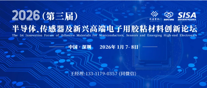 为推进胶企精准把脉中国半导体、传感器等新兴高端电子用胶市场与技术最新发展趋势,助推中国高端电子用胶产业快速高质发展,在2023年、2024年连续成功举办二届“半导体及高端电子用胶粘材料创新论坛”的基础上,粘接资讯、新材料产业联盟、深圳市智能传感行业协会等单位特于2026年1月7日-8日在深圳举办“2026(第三届)半导体、传感器及新兴高端电子用胶粘材料创新论坛”。