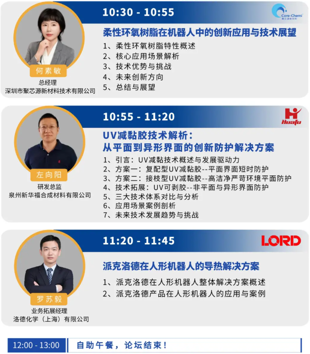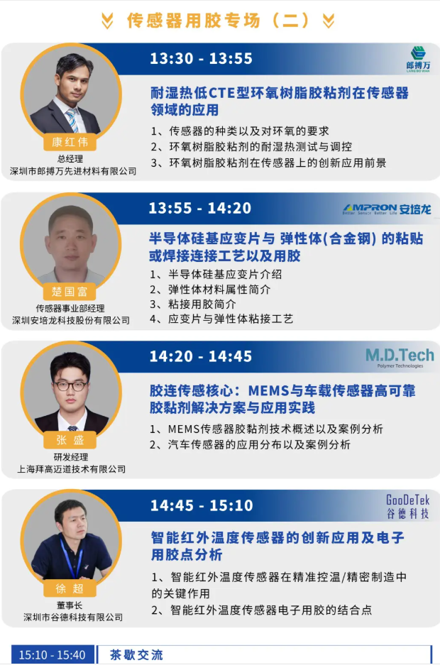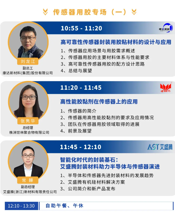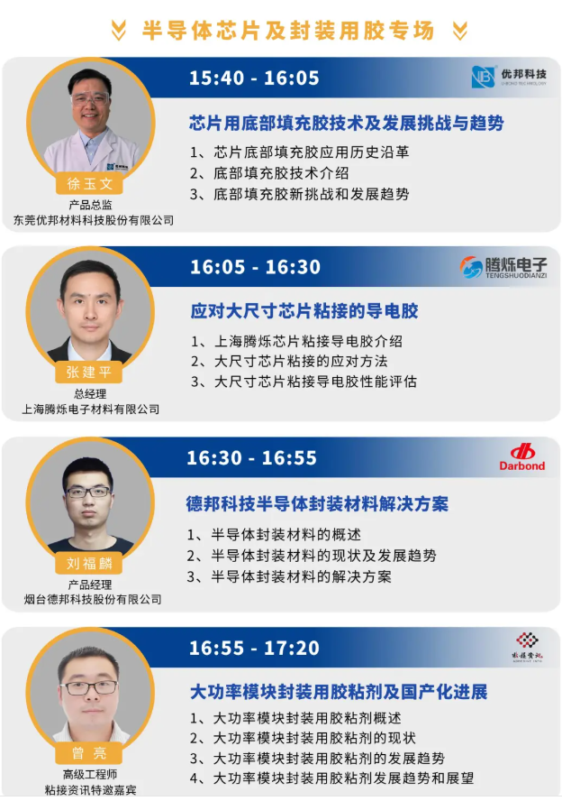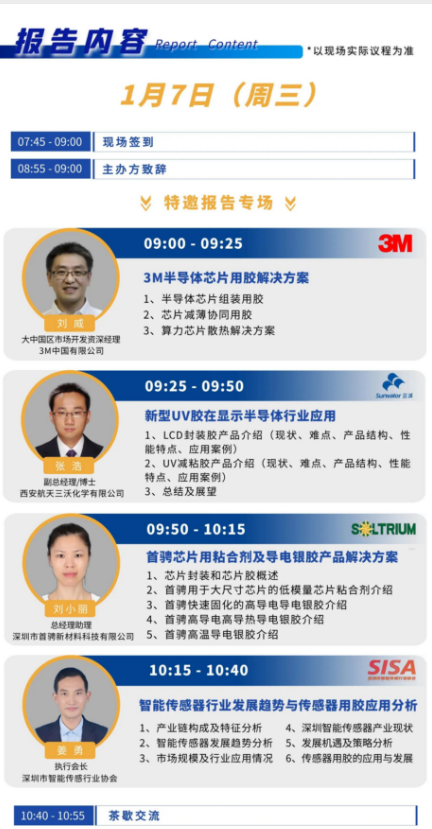 本次论坛将重点围绕半导体、传感器、机器人、低空经济等新兴高端电子用胶方向邀请报告。仍有多篇报告在邀请确认中,欢迎从事相关研究的企业和院校、机构踊跃联系报告演讲,报告发言联系方式:张老师 136671899191(同微)。部分已确认报告如下: