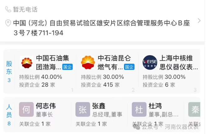 近日,昆仑(雄安)仪器仪表有限公司成立,法定代表人为何志伟,注册资本2000万人民币,经营范围含智能仪器仪表制造、智能仪器仪表销售、集成电路制造、集成电路销售、集成电路设计、电子产品销售、通信设备制造、通信设备销售、计量技术服务、信息技术咨询服务等。股东信息显示,该公司由中国石油集团渤海石油装备制造有限公司、中石油昆仑燃气有限公司、上海中核维思仪器仪表股份有限公司共同持股。