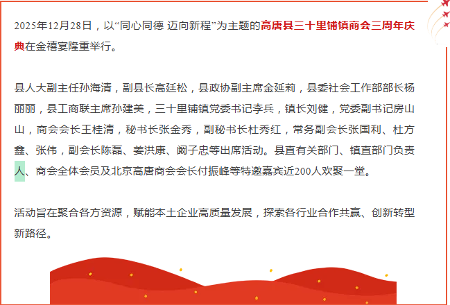 副县长高廷松发表致辞,他代表县委、县政府对三十里铺镇商会一年来取得的成绩表示祝贺,并希望商会继续发挥桥梁纽带作用,为高唐县经济社会高质量发展贡献更大力量。