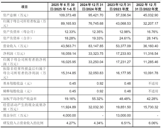 业绩方面,报告期(2022年至2024年、2025年上半年)各期,三瑞智能分别实现营收3.62亿元、5.34亿元、8.31亿元、4.36亿元;归母净利润1.13亿元、1.72亿元、3.33亿元、1.6亿元。