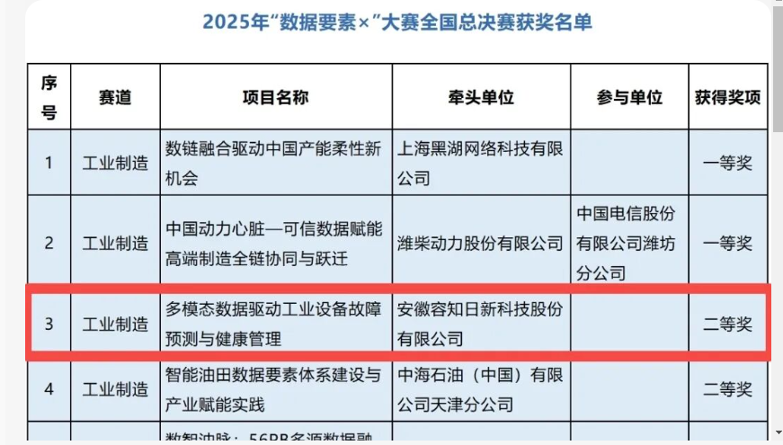 2026-01-13近日,在2025年“数据要素×”大赛全国总决赛中,容知日新凭借“多模态数据驱动工业设备故障预测与健康管理”项目,荣获工业制造赛道全国第三名。