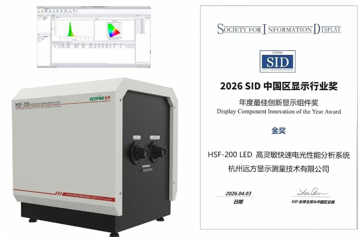 大会同期举行SID 中国区显示行业奖(CDIA)评选。该奖项由专业专家委员会评审,旨在表彰具有创新性、先进性与行业价值的技术与产品。远方HSF-200 LED高灵敏快速电光性能分析系统凭借多项自主创新技术,在参评仪器设备中脱颖而出,荣获2026年度金奖。该系统融合特殊采样积分球、微纳高速电源、高灵敏探测单元等核心设计,可采集测量10⁻⁵mW 极弱辐射信号,实现Micro-LED 芯片级多维度参数的精准测量。