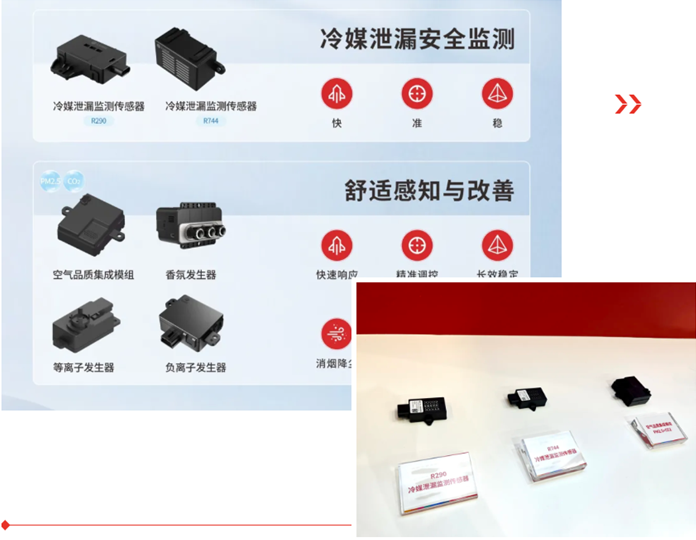 随着智能汽车普及,汽车空调逐渐升级为保障驾乘舒适与安全的核心单元。四方光电提供完善的空调舒适及安全解决方案:PM2.5传感器、CO₂传感器、AQS空气质量传感器实时监测座舱空气品质,联动空调或新风系统,守护健康呼吸环境;香氛发生器、负离子/等离子发生器等装置,有效提升座舱舒适性;R290/R744冷媒传感器实时监测冷媒泄漏,全方位护航汽车安全。