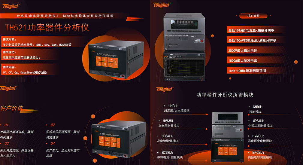 TH521系列具备多达数十种参数特性的测试能力,尤其在关键指标的准确度提升上表现卓越。针对静态特性测试中的导通电阻Rds-on、电容电压特性分析中的栅极电阻Rg,以及高频场景下极易失准的反向传输电容Crss,同惠电子通过不断研究测试,从根本上解决了第三代半导体器件特性表征的行业痛点。