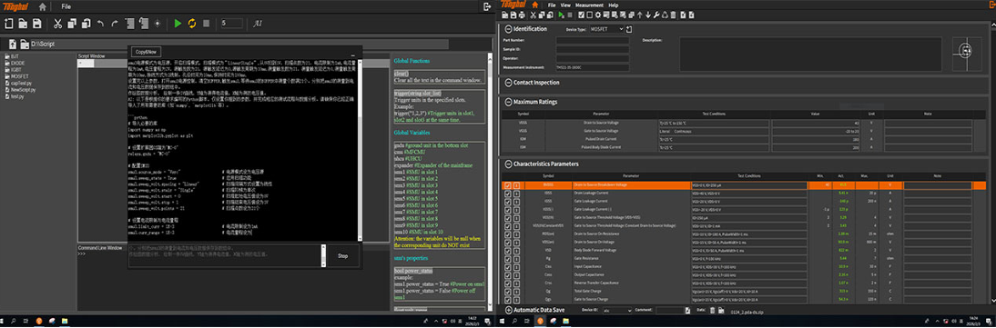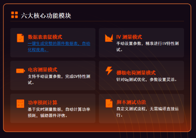 ● 多参数集成:单机集成IV(电流-电压)、CV(电容-电压)、Qg(栅极电荷)、脚本测试及Datasheet五大核心模块,实现静态稳态特性与动态开关性能的全维度测试。