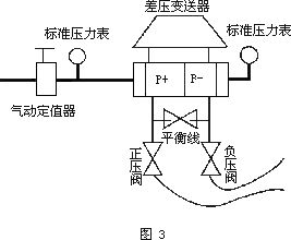 由于我们公司设备投产较早,仍然部分使用气动差压流量计。下面我把对气动差压变送器(配三阀组)的校验方法介绍一下,连接如(图3):