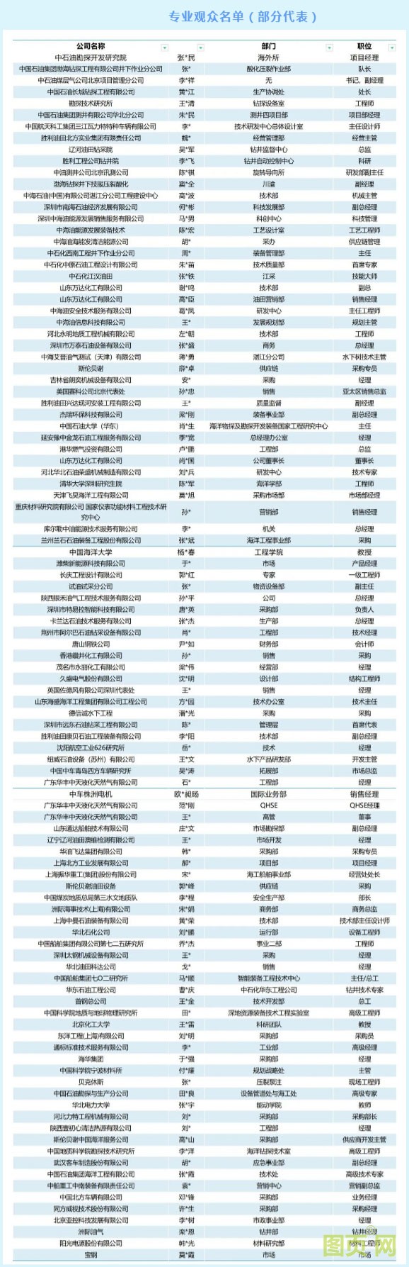 目前,cippe2022深圳石化展特邀用户观众名录展示有单位和联系人名称及职务 :中油测井、中石油勘探开发研究院、辽河油田、大庆试油试采分公司、中石化华东石油工程、胜利油田康贝石油、胜利油田钻井院、中海油信息技术、中海油海洋工程股份、中国南海工程有限公司、陕西银禾油气工程技术、山东卡兰达石油技术服务公司、深圳远东石油钻采工程、中国船舶702研究所、德信诚水下工程、山东海盛海洋工程、振华重工、中车青岛四方车辆研究所、广东华丰中天液化天然气、阳光电源、宝钢、巴斯夫、茂名永丽化工、香港鑽井化工等多家专业观众参观团已登记。