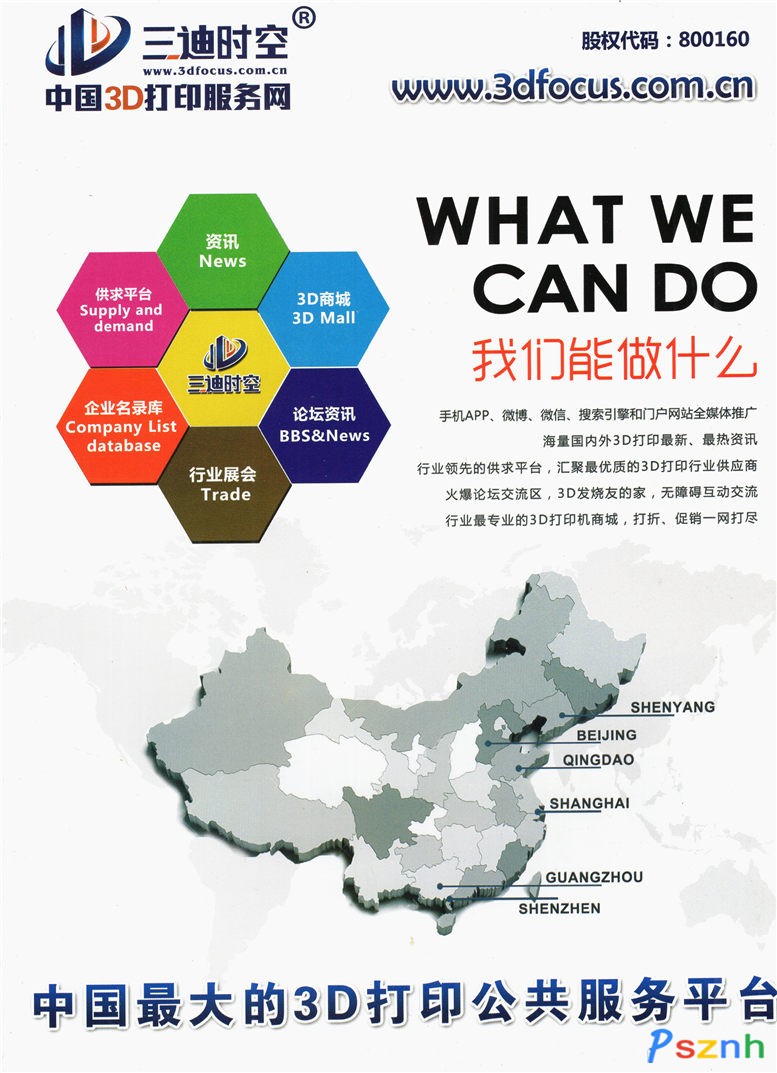 旗下三迪时空网(www.3dfocus.com.cn)拥有行业门户资讯、B2C电商商城、B2B供求平台、论坛、企业名录库、行业展会六大功能。一键进入三迪时空网,为用户提供海量资讯、实时价格咨询、专业团队在线客服等全方位服务。截至目前,三迪时空平台已有个人会员145.6万,企业会员1241家,下游行业应用(航空航天、生物医疗、教育、机械制造、模具、机器人、金属加工、数控机床等)企业8.15万家,占有全国3D打印行业客户中95%以上市场份额。2014年11月,三迪时空网英文国际站上线(www.3dfocus.cn)。