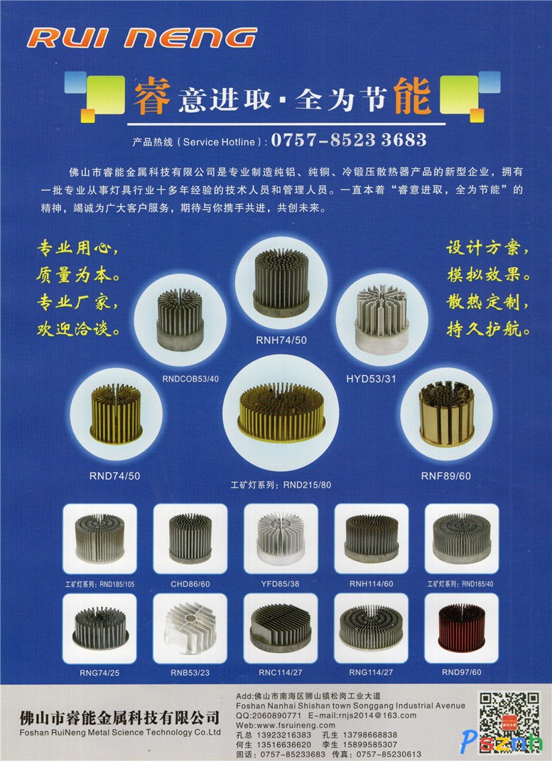 睿能金属是冷锻散热器生产厂家,产品包括:散热器,LED散热器,LED灯散热器,冷锻铝散热器,太阳花散热器,铝散热器.作为散热器厂家或散热器公司(散热器厂)专业从事冷锻加工提供优质大功率LED灯配件,投光灯散热器,泛光灯散热器,工矿灯散热器,天花射灯散热器,筒灯散热器,轨道射灯散热器,导轨射灯散热器,格栅灯散热器,鳍片散热器.