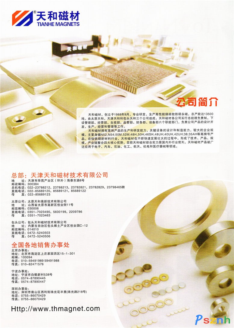 天和磁材,创立于1988年9月,是专业研发、生产、销售高性能永磁材料的国家级重点高新企业、科技创新型企业。由太原天和、天津天和和包头天和三个公司组成,注册资金总额达1.55个亿。主营烧结钕铁硼(NdFeB)和烧结钐钴(SmCo)永磁材料,总产能逾10000t,是中国最大稀土永磁材料制造商之一。