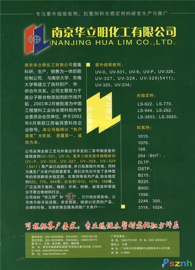 南京华立明化工有限公司是集科研、生产、销售为一体的股份制企业, 与南京大学、东南大学等建立了良好的产、学、研合作关系。公司主要致力于高分子聚合物添加剂的市场开拓及销售推广,2001年2月被批准为工程塑料工业协会塑料助剂专业委员会会员单位, 并于2002年6月荣获江苏省民营科技企业称号。本公司始终以“客户需要”为宗旨, 质量为先、诚信为本。