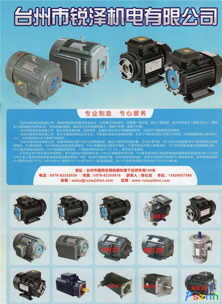 “台州市锐泽机电有限公司”是电机制造和销售的专业企业,公司奉行科技领先,质量第一的宗旨,建立了集科研,设计和开发于一体技术中心,具有实力雄厚的技术研究队伍,并有迅速的售前、售后技术支持和服务能力,想客户所想,做客户所需。