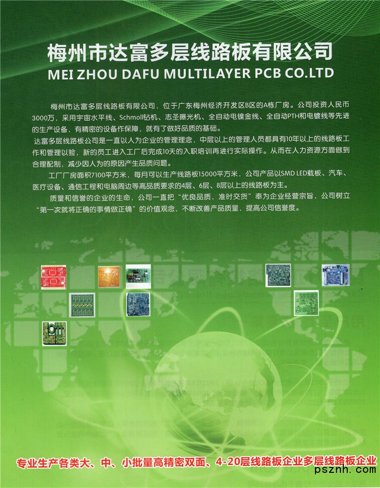 梅州市达富多层线路板有限公司生产高密度和高可靠性的多层线路板,广泛用于电脑、通讯、航空、家电、数控、医疗、数码产品、仪器仪表等高科技领域。