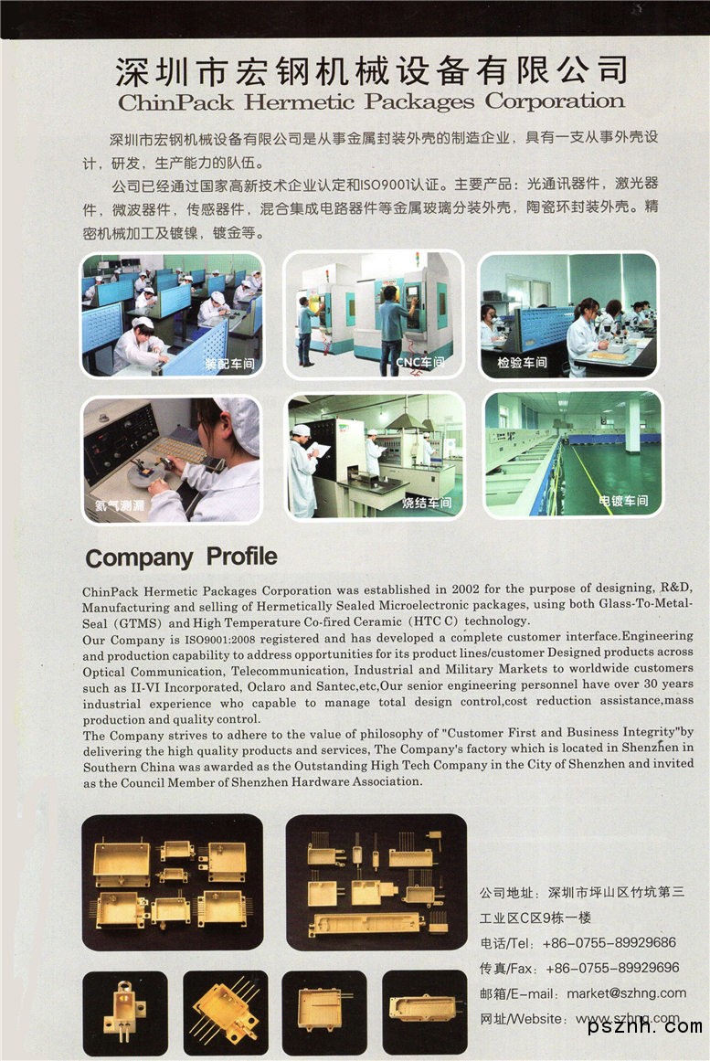 深圳市宏钢机械设备有限公司是一家专业从事金属封装外壳的制造企业,具有一批从事外壳设计、研发、加工、烧结、电镀的专业团队。