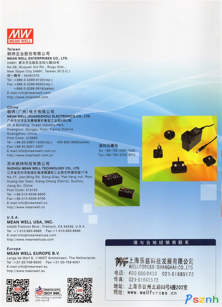 未来明纬(广州)电子有限公司仍会不断的持续改善,提升服务质量,并期许自己成为国人在开关电源上的第一选择,成为客户永久信赖的电源伙伴。 MEAN WELL USA & MEAN WELL EUROPE 明纬不仅仅是一个生产高质量交换式电源的制造商,我们亦希望成为一个出色的电源通路整合中心。基于这个理念,MEAN WELL USA于公元1999年8月在美国加州 Fremont 市成立,MEAN WELL Europe BV亦于2006年在欧洲荷兰Amstelveen市成立,提供全球客户迅速的在地化服务。此二明纬成员主要的任务在于提供技术支持、项目评估、快速交货、产品维修与不良分析等服务给位于美国、加拿大与欧洲的客户,以节省客户的时间与成本。