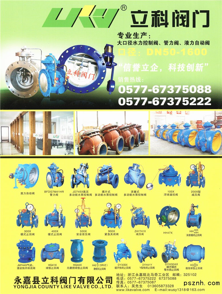 永嘉县立科阀门有限公司是一家专业从事阀门设计,开发, 制造, 销售为一体的股份制造合作企业,坐落在永嘉县瓯北镇马岙工业区,是一家专业生产各种;闸阀,截止阀,止回阀,球阀,蝶阀,管力阀,液力自动阀,锻钢阀,不锈钢阀,BFDZ701X液力自动控制阀,BFDG7M41HR管力阀,H42T静音止回阀,HH48X微阻缓闭止回阀,HQ44X球型止回阀,YX741X可调式减压稳压阀,ZAX742X安全泄压阀,ZJ145X电动遥控阀,F745X水力(遥控)浮球阀,JD745X多功能水泵控制阀,DY30AX缓开缓闭多功能止回阀,DY30BX缓开快闭多功能止回阀,JD745X高压多功能水泵控制阀,HH47X消声微阻缓闭止回阀,JM744X膜片式液压,气动角式快开排泥阀,100X遥控浮球阀,200X减压阀,300X缓闭止回阀,400X流量控制阀,500X泄压持压阀,600X水力控制阀,700X水泵控制阀,800X压差旁通平衡阀,900X紧急关闭阀等。公司设有生产部,技术部,品管部,销售部,财务部等部门。是一家科研,开发,生产,销售,服务与一体的现代化企业。不断采用新技术,新工艺,新材料,积极开发新产品,为建设现代化阀门企业而努力奋斗。经过不不惜努力,公司产品销售覆盖大江南北,深得广大用户信赖与和评。公司坚持贯彻质量第一,服务周到为经营目的,可以可靠性,可用性为目标创建一流名牌,以优惠的价格,良好的售后服务为广大新老用户服务。