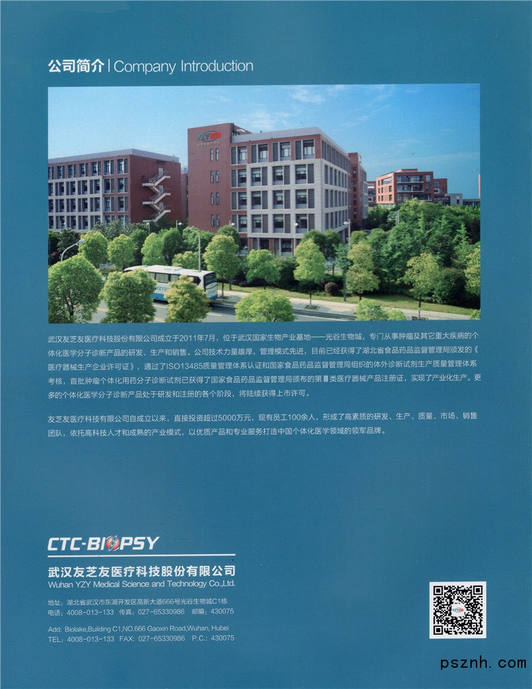 武汉友芝友医疗科技股份有限公司(证券简称:芝友医疗,证券代码:837794)成立于2011年7月,位于武汉国家生物产业基地-武汉光谷生物城。公司以肿瘤及其他重大疾病的个体化医学诊疗为战略方向,是一家专门从事个体化用药基因诊断试剂和诊断设备研发、生产和销售的高新技术企业。公司的产品线包括个体化用药基因诊断试剂盒和循环肿瘤细胞检测设备两个方向,旨在为临床医生实施个体化治疗提供检测手段,以提高医疗水平,造福社会。
