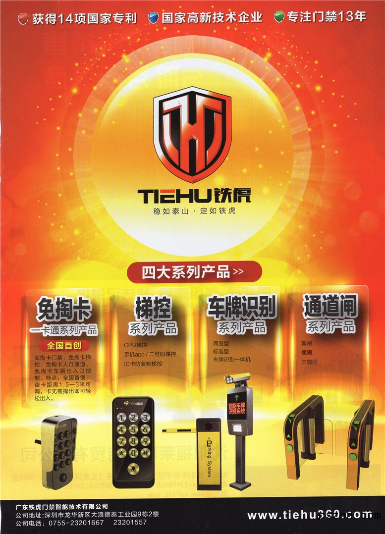 深圳市铁虎门禁智能技术有限公司,是一家专业致力于物业管理辅助系统,包括道闸、门禁、梯控等一卡通产品的研发、设计、生产、销售的国家级高新技术企业,公司最早成立于2004年,总部设在深圳。拥有14年生产经验积淀,软硬件完全自主研发,拥有14项国家专利、12项软件著作权。公司销售及服务网络遍布全国,以支持工程商伙伴为核心,不与工程商抢市场为企业价值观。