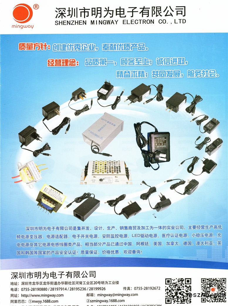 深圳市明为电子有限公司是集开发、设计、生产、销售商贸及加工为一体的实业公司。主要经营生产高低频电源变压器、电源适配器、电子开关电源、安防监控电源、LED驱动电源、医疗认证电源、小稳压电源、充电电源及其它电源电感线圈类产品。相当部分产品已通过中国、阿根廷、美国、加拿大、德国、澳大利亚、英国和韩国等国家的安全认证。我们有一批勤恳踏实和经验丰富的技术人员及业务骨干,竭诚为各厂家、科研单位提供优良产品和令客户满意的售后服务!
