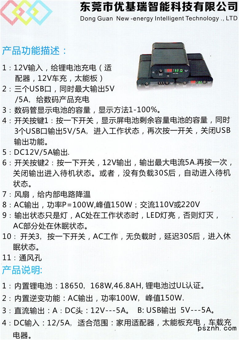 东莞市优基瑞智能科技有限公司是一家专业从事研发、生产和销售移动电源、动力锂电池高新技术企业,广泛应用于电子数码、蓝牙、手机、MP3、MP4、航模 、电动工具、 PDA、笔记本电脑、电动自行车、电动摩托车、电动汽车、后备电源、医疗设备、保暖设备、便携式设备、安防设备等领域; 我司有着专业与创新的技术研究团队,并和湖南大学合作开发动力锂电池保护系统。并获多项专利。及严谨务实的生产队伍和先进的生产及检测设备,公司已通过ISO9001:2000国际质量认证认证,产品也均通过了CE,RoHS,FCC等认证,动力锂电池也得到了国家及国外权威机构全面的安全和性能检测。公司凭着技术上的创新、品质的优化和售后服务的不断革新,已被广大海内外消费者都所认可。 我司将继续以市场需求为导向,以科技创新为基础,以完善的质量控制体系为依托,为全球消费者沟通、娱乐提供智能化、便携式绿色电力供应服务,让人们更好享受科技生活!