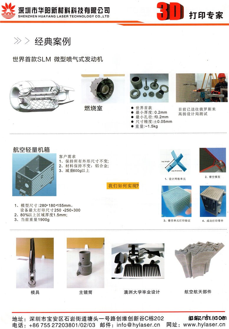 深圳市华阳新材料科技有限公司是一家专业致力于金属3D打印技术研发生产和销售、金属3D打印设备研发生产和销售、金属粉末材料研发、高温合金材料研发、新型陶瓷材料研发、新型复合材料研发,进出口贸易服务的高科技企业。目前已成功打印产品有:航空航天部件,微型发动机,燃气轮机,燃油喷嘴,减重机箱,散热器,异形件,模具,工艺品等。