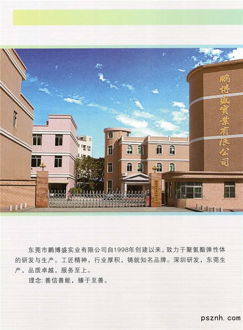 东莞市鹏博盛实业有限公司创立于1998年,专注研发聚氨酯高分子新材料,集生产、质控、营销一体化,被评定为国家高新技术企业,生产研发基地位于东莞市。 致力于聚氨酯弹性体、橡胶、机电配套产品和不饱和树脂等产品的研发和生产,综合实力雄厚,“鹏博盛(PEPSON)”品牌己成为业界的知名品牌,享有盛誉。
