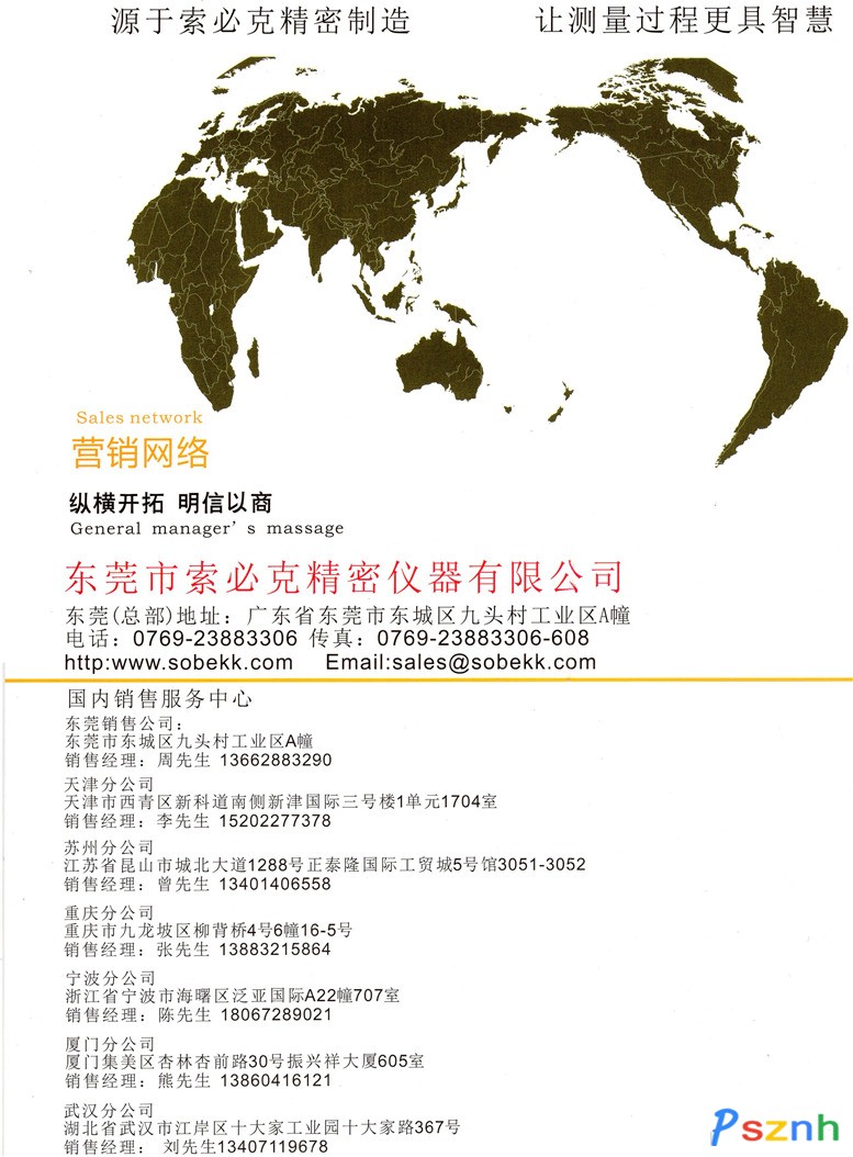 东莞市索必克精密仪器有限公司是一家具有15年从业经验、具有开拓创新精神的仪器行业精英团队组建的高科技股份制制造企业,自主研发、生产、销售、各类工业用高精度光学测量仪器。在台湾设立一个研发中心,在大陆拥有六大营销售后服务中心和一个海外事业部。致力于为精密制造客户提供工业自动化与智能化的产品与解决方案,主要针对产品尺寸测量,表面缺陷检测,自支化生产装配等各环节,帮助客户提升质量,改善效 索必克(Sobek)目前拥有精密影像测量仪器,影像测量自动化设备,影像检测自动化设备和影像组装自动化设备等四大产品系列。其中精密测量仪器设备与解决方案已成功运用到包括电子,五金、塑胶、模具、钟表、陶瓷、PCB板、汽车零件等行业。索必克(Sobek)拥有全国性的服务网络(广东,江苏,天津,上海,浙江,福建,成都,武汉,台湾,泰国,韩国等国内国外销售售后服务中心)高品质,高效率的服务团队,为客户提供零距离的服务,免费上门安装调式与培训,一年免费保修期,非盈利性的后续服务方案等一系列保障措施,保证客户的高效使用及技术支持。