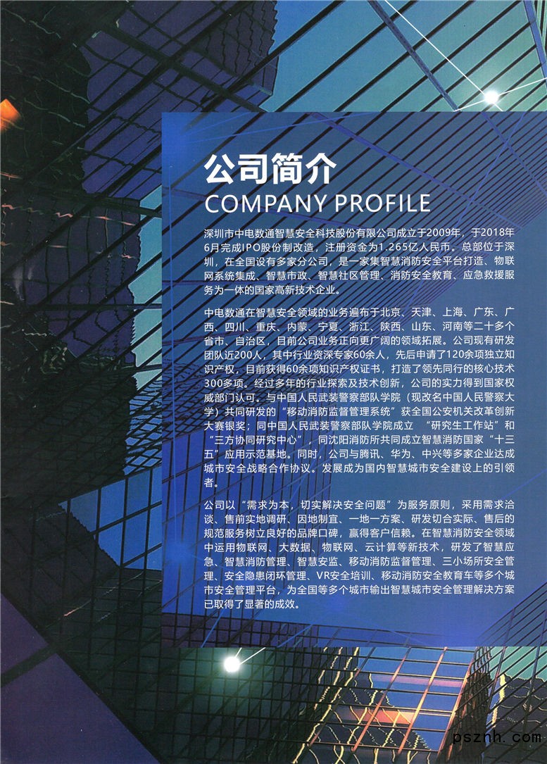 深圳市中电数通智慧安全科技股份有限公司成立于2009年,于2018年6月完成IPO股份制改造,注册资金为1.265亿人民币。总部位于深圳,在全国设有多家分公司,是一家集智慧消防安全平台打造、物联网系统集成、智慧市政、智慧社区管理、消防安全教育、应急救援服务为一体的国家高新技术企业。