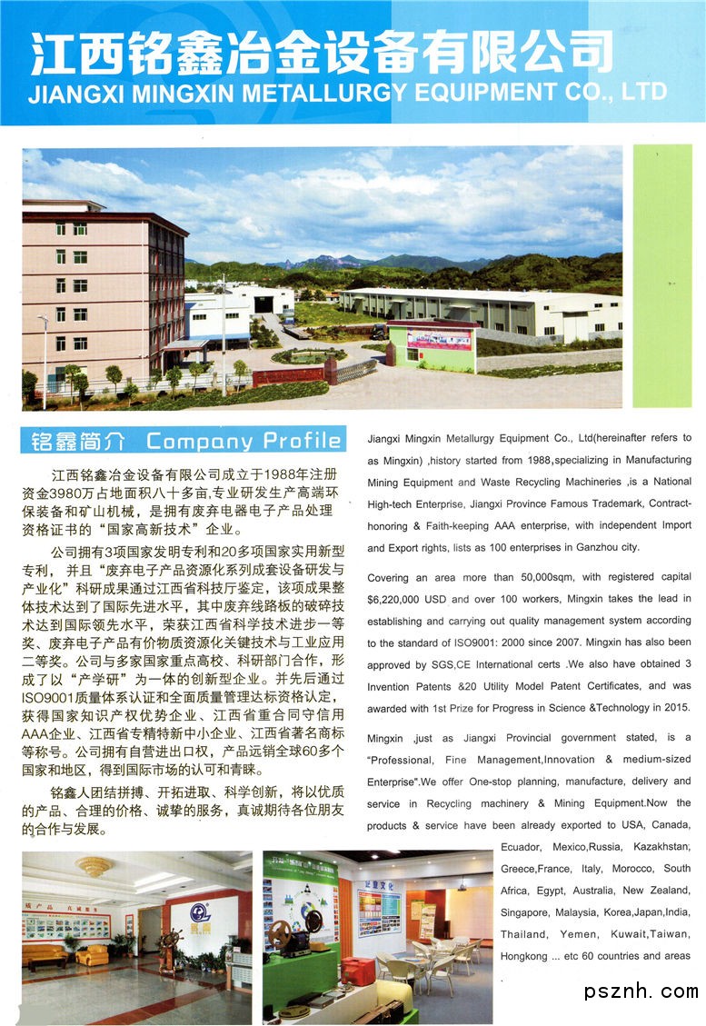 江西铭鑫冶金设备有限公司成立于1988年注册资金3980万占地面积八十多亩,专业研发生产高端环保装备和矿山机械,是拥有废弃电器电子产品处理资格证书的“国家高新技术”企业。