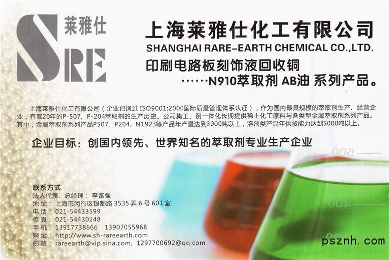 上海莱雅仕化工有限公司作为国内最具规模的金属萃取剂专业供应商。公司长期提供稀土化工原料与各类型金属萃取剂系列产品。其中,金属萃取剂系列N1923、N910、N902、N235、N503、P-507、P-204、P350、TRPO(Cyanex923)、TBP、Cyanex272、CA-12、精制脱脂环烷酸等产品享誉国内外市场,溶剂类产品异辛醇、仲辛醇、冶金专用植物胶(瓜尔胶)、磺化煤油、260号溶剂油等产品畅销国内市场。