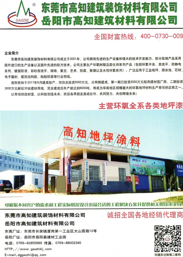 岳阳高知于2017年8月建成投产,项目总投资5000万元,分两期建成,第一期已投资2000万元租用建材园厂房,二期投资3000万元新征30亩建材用地,完全建成后年产能达到8000吨,将成为华南地区规模型环氧地坪材料生产商与供应商。
