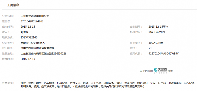 山东鑫宇诺轴承有限公司批发、零售:轴承、汽车配件、机械设备、五金交电、钢材、电子产品、机电设备、建材、仪器仪表、消防器材、空调、日用品、桶装润滑油、电气设备、照明设备、模具、空气净化器;进出口业务。(依法须经批准的项目,经相关部门批准后方可开展经营活动)