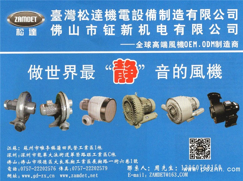佛山市钲新机电有限公司隶属于台湾松达工业股份有限公司大陆机电事业部,主营“ZAMDET松达”牌高压、中压鼓风机、多翼式鼓风机、AC/DC齿轮减速马达、微型马达、同时也是台湾利明、万鑫、城邦(CPG)、东炜庭(TWT)协约经销商。主要生产销售松达高压风机HB系列、2HB系列;中压鼓风机CX系列、TB系列、HTB系列、PF系列;低压鼓风机CY系列。