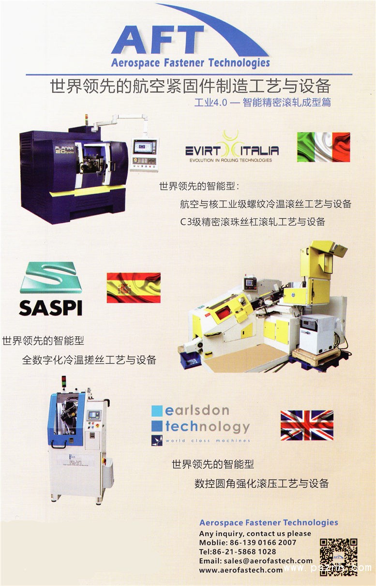 艾洛钛紧固件(上海)有限公司【Aerospace Fastener Technologies (Shanghai) Co. Ltd】,简称AFT SH,是由其母公司-英国航空紧固件技术有限公司【Aerospace Fastener Technologies (UK) Ltd】,简称AFT UK,投资成立的的外资公司,注册地址在中国(上海)自由贸易试验区所专属的欧美国际机床贸易版块 ★输出全球领先的航空航天紧固件主流制造工艺与设备 ★输出全球领先的核电工业螺柱螺纹滚丝工艺与设备 ★输出全球领先的高铁紧固件主流制造工艺与设备 ★输出上述技术与工艺的集成与全方位技术服务、新工艺开发等