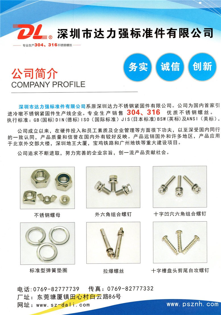 深圳市达力强标准件有限公司系原深圳达力不锈钢紧固件有限公司。公司为国内首家引进冷墩不锈钢紧固件生产线企业。采用日本和韩国原材料304HC’’302HQ和316优质不锈钢材质。执行标准:GB(国标)DIN(德标)ISO(国际标准)JIS(日本标准)BSW(英标)及ANSI(美标)。 公司成立以来,在硬件投入和员工素质及企业管理等方面很下功夫,以至深受国内同行的一致认同,产品质量和信誉在国内外有较好反映。产品远销国外和许多地区,产品应用于北京外交部大楼,深圳地王大厦,宝鸡铁路和广州地铁等重大建设项目。 公司追求不断进取,努力完善的企业宗旨,创一流产品贡献社会。本公司占地面积达3000平米,拥有各种先进企业生产设备,办公设备齐全,净资产3000万。