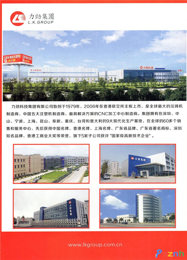 力劲科技集团有限公司1979年创立于香港,是一家专业从事设计、制造和销售冷、热室压铸机及镁合金压铸机、精密注塑机和计算机数控加工中心的技术和资本密集型企业集团。经过30余年的发展,集团已经成为世界最大的压铸机制造商、中国五大注塑机制造商和中国主要的电脑数控加工中心(CNC加工中心)制造商之一。集团于2006年10月在香港联交所主板成功上市。