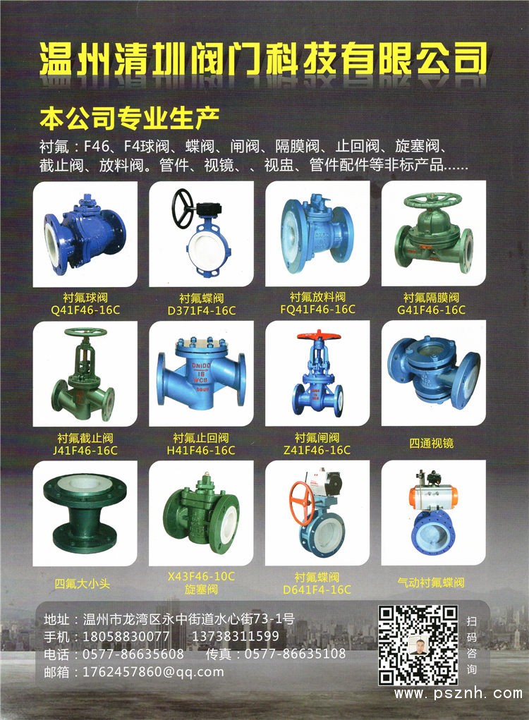 温州清圳阀门科技有限公司位于浙江省温州龙湾区,生产多种氟塑料衬里耐腐蚀阀门及管路附件,公司主要产品有衬氟阀门,衬氟球阀、衬氟蝶阀、衬氟闸阀、衬氟隔膜阀、衬氟截止阀、衬氟放料阀、管夹阀,衬氟管件,衬氟视镜,衬氟视盅,衬胶阀门,塑胶阀门等各类产品。