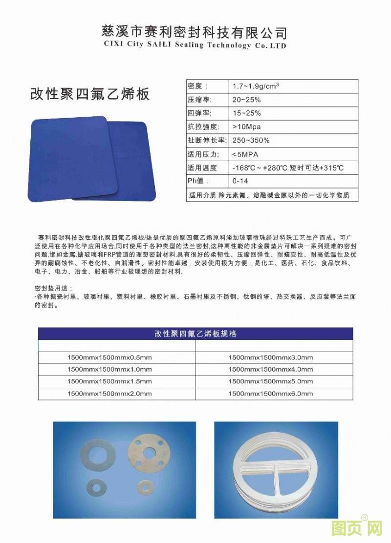 慈溪市赛利密封科技有限公司成立于2003年,是国内第一批研究生产膨体四氟产品的工厂。在将近15年的坚持探索研究中开发膨体四氟多向拉伸膜,膨体四氟板,玻璃微珠膨化四氟板。赛利公司的密封产品是由100%膨体聚四氟乙烯纤维制成,将普通的聚四氟乙烯膨化成一种具有高强度而且多孔的新材料。它保持了聚四氟乙烯本身的卓越性能(极佳的化学稳定性;极低的摩擦系数;广阔的适用温度范围;不会老化;永久耐用)更为重要的是它从根本上解决了聚四氟乙烯的通病-蠕变和冷流,与纯聚四氟乙烯和填充聚四氟乙烯相比结果大为改善。