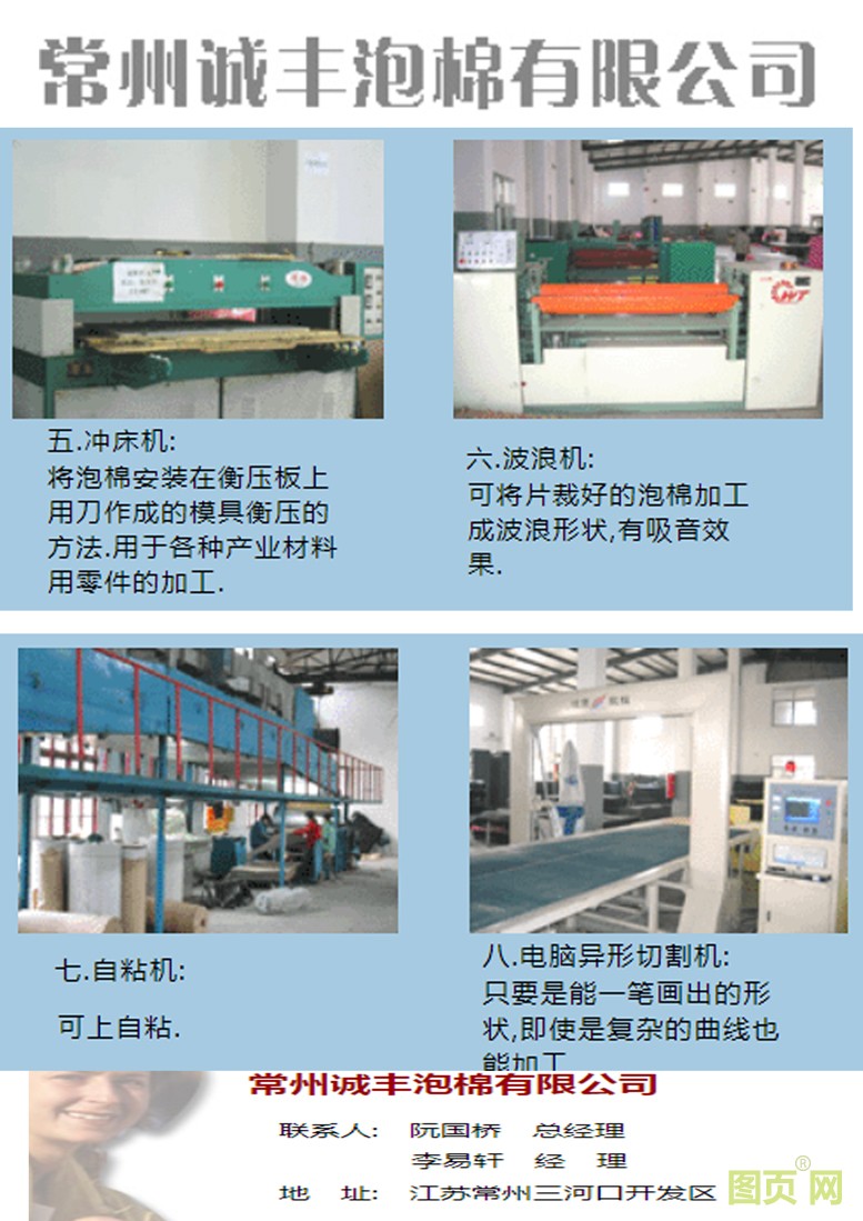 常州诚丰泡棉有限公司成立于公元一九九九于公元二零零二与台湾合资为一中外合资企业资本额100万美元.年产量1000吨占地面积五十亩,产品种类完善,工厂座落于江苏省常州市焦溪镇三河口开发区内,由沪宁高速横山站下向西行十分钟.本公司产品主要应用于空调配件.摩托车配件.汽车消音隔热.电子絶缘材料.包装材料.制刷.清洁用品.枕头.家具等用途.客户分布全国.现有职工七十多人.加工设备齐全.