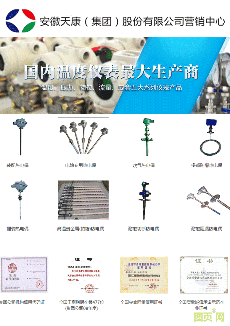安徽天康(集团)股份有限公司 工业热电阻系列 双金属温度计 压力表系列 压力变送器系列 液位计系列