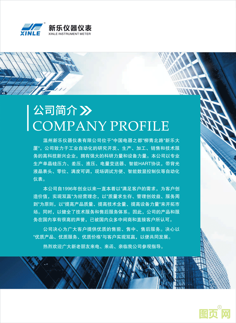 温州新乐仪器仪表有限公司位于"中国电器之都"柳青北路"新乐大厦",公司致力于工业自动化的研究开发、生产、加工、销售和技术服务的高科技新兴企业,拥有强大的科研力量和设备力量。 本公司以专业生产压力、差压、液压、电量变送器、智能HART协议,带背光液晶表头、零位、满度可调,现场调试方便、智能数显控制仪等自动化仪表。