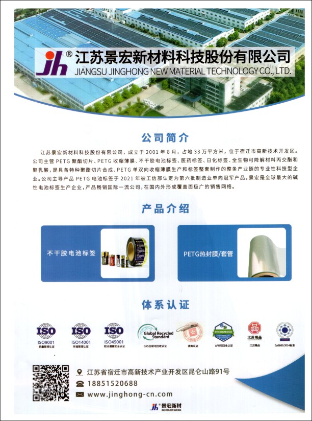 江苏景宏新材料科技股份有限公司,成立于2001年8月,占地33万平方米,位于宿迁市高新技术开发区公司主营 PETG聚酣切片、PETG收缩薄膜、不干胶电池标签、医药标签、日化标签、全生物可降解材料丙交附和聚乳酸,是具备特种聚甜切片合成、PETG单双向收缩薄膜生产和标签整套制作的整条产业链的专业性科技型企业。公司主导产品 PETG电池标签于 2021年被工信部认定为第六批制造业单向冠军产品。最宏是全球最大的碱性电池标签生产企业,产品畅镇国际一流公司,在国内外形成覆盖面极广的销售网络
