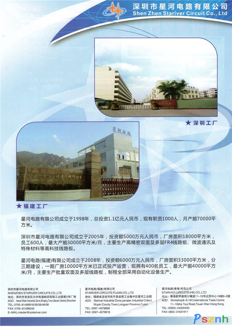深圳市星河电路股份有限公司成立于1998年8月。是一家以高端印制电路板生产为主,集设计、加工、销售、外贸为一体的国家高新技术企业,具有深圳、福建和湖北三个生产基地,主营产品为2-16层电路板,包括普通双面、多层、厚铜和高频、金属基等特殊电路板,产品广泛应用于通讯设备、汽车电子、工控电脑,医疗器械、军工高科技产品、家用电子产品、新能源等领域。
