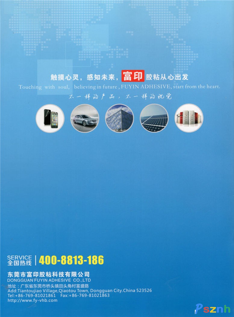 东莞市富印胶粘科技有限公司成立于2001年,是一家集研发、生产、销售和服务于一体的专业文具胶带、家用胶带生产企业,也是中国最早引进泡棉胶带生产线的厂家之一。2006年总公司迁至中国荷花名镇-东莞桥头。富印专注于为客户解决生产过程中所遇到粘接难题,提供快速合理的应用解决方案,并根据客户需要开发、调配各种适合具体生产工艺流程的特殊胶粘带,努力打造成中国胶粘带行业专业、创新的现代化生产企业,并立志成为“中国胶粘带行业最具影响力的领航企业之一”。 “韩国技术,富印天下”。多年来,富印人从全方位的社会角度积极倡导“绿色、环保、健康”的理念,致力实现“责任、创新、诚信、共赢”的经营之道,立足品质和品牌,不断推陈出新。2006年,富印在引进国外高新技术的基础上,开发了文具胶带、家用胶带、无基材双面胶带、导热胶带、泡棉胶带、手机和电视超薄专用胶带、PET单双面胶带、无纺布/棉纸双面胶带、保护膜、布基胶带、纤维胶带、挂钩胶带等11大系列100余种产品。2009年,富印又吸引了拥有30年胶粘带研发、生产经验的韩国研发和技术团队的加盟,并引进了压克力(FY-VHB)胶带生产线,研发生产出了压克力(FY-VHB)和OCA光学胶带。目前这些产品经过通过SGS等方面的国际认证。 “改变工艺,服务产品”。“富印”系列胶粘带广泛应用于文具、家用、汽摩配、电子、电器、电磁、通讯、机电、电声、灯饰、LED光电、五金塑胶铭牌、体育用品、玻璃家具、工艺礼品、饰品、玩具、模具、建筑、装配、航天、机器、机器制造、军工厂等多个工业领域。 富印整合多种营销模式,拥有一流的营销服务网络,目前公司已经在深圳、温州、义乌、上海、北京等地设有分公司或办事处。产品响誉国内,远销到加拿大、美国、俄罗斯、智利、阿联酋等国家。成为富士康、TCL、比亚迪等国内外更多知名企业的直接或间接供应商之一。公司拥有独立自主的进出口权,“责任、创新、诚信、共赢”,富印胶粘为客户提供专业、专营、专注全面的服务。并随时欢迎、期待新的合作者成为我们的服务对象,提出您新的要求!富印人将以全新的思维、全新的管理、全新的产品,与您实现共赢.