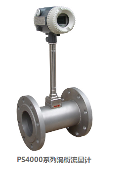 PS4000系列涡街流量计是以卡门和斯特罗哈尔有关旋涡的产品和旋涡与流量关系的理论为依据来测量蒸汽、气体及低粘度液体的流量。如图一所示,在表体中垂直插入一根三角柱即旋涡的发生体,当表体中有介质流过时,在三角柱的后面交替产生方向相反有规则的卡门旋涡,其旋涡的分离频率F与介质的流动速度V成正比。通过传感头检测出旋涡的个数,就可以测算出流体流速,再根据表体口径计算出被测介质的体积流量。