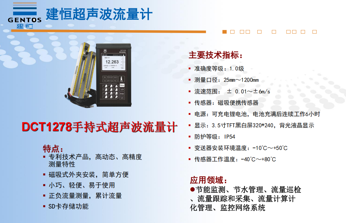 适用于单一液体介质,液体中无大量杂质、颗粒、悬浮物或气泡,而且是满管的流体测量。使用范围广,导声液体均可测量