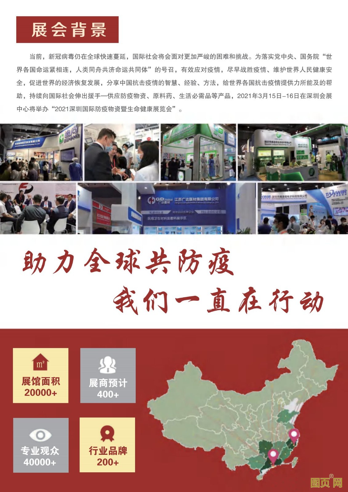 当前,新冠病毒仍在全球快速蔓延,国际社会将会面对更加严峻的困难和挑战。为落实党中央、国务院“世界各国命运紧相连,人类同舟共济命运共同体”的号召,有效应对疫情,尽早战胜疫情、维护世界人民健康安全,促进世界的经济恢复发展,分享中国抗击疫情的智慧、经验、方法,给世界各国抗击疫情提供力所能及的帮助,持续向国际社会伸出援手——供应防疫物资、原料药、生活必需品等产品,2021年3月15日-16日在深圳会展中心将举办“2021深圳国际防疫物资暨生命健康展览会”。